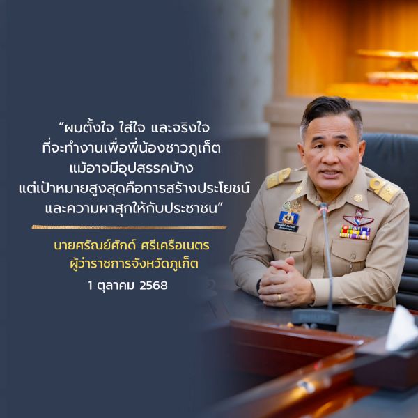 วันนี้ (1 ตุลาคม 2568) นายศรัณย์ศักด์ ศรีเครือเนตร ผู้ว่าราชการจังหวัดภูเก็ต เปิดเผยถึงแนวนโยบายการทำงานภายหลังเข้ารับตำแหน่งอย่างเป็นทางการโดยได้กล่าวว่า จะมุ่งสานต่องานที่อดีตผู้ว่าราชการจังหวัดภูเก็ตได้วางรากฐานไว้ โดยเฉพาะยุทธศาสตร์การพัฒนาจังหวัดที่บูรณาการความร่วมมือจากทั้งภาครัฐและภาคเอกชน เพื่อให้การขับเคลื่อนเป็นไปอย่างต่อเนื่องและมีประสิทธิภาพ ผู้ว่าราชการจังหวัดภูเก็ตกล่าวว่า หลายประเด็นสำคัญเป็นเรื่องเร่งด่วนที่ต้องดำเนินการทันที เช่น การแก้ไขปัญหาการจราจรในตัวเมือง การพัฒนาระบบขนส่งสาธารณะ รวมถึงการผลักดันโครงการเรือด่วนทางน้ำ เพื่อช่วยลดความแออัดบนท้องถนน ควบคู่กับการนำเทคโนโลยีสมัยใหม่ อาทิ Big Data มาใช้สนับสนุนด้านการจราจร ความปลอดภัย และการยกระดับคุณภาพบริการด้านการท่องเที่ยว