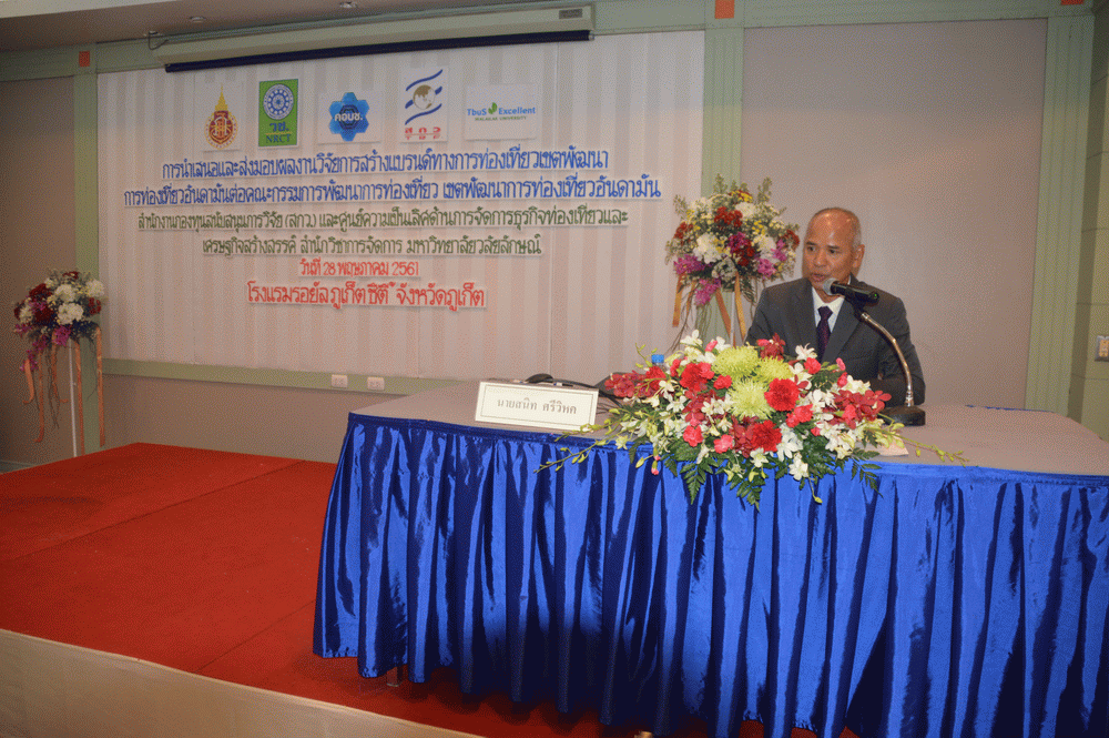 วันนี้ (28 พ.ค. 61) ที่ห้องบอน-ไม้ท่อน โรงแรมรอยัลภูเก็ตซิตี้ นายสนิท ศรีวิหค รองผู้ว่าราชการจังหวัดภูเก็ต เป็นประธานในพิธีเปิดการนำเสนอและส่งมอบผลงานวิจัย การสร้างแบรนด์การท่องเที่ยวเขตพัฒนาการท่องเที่ยวอันดามันให้กับคณะกรรมการพัฒนาการท่องเที่ยวประจำเขตพัฒนาการท่องเที่ยวอันดามันโดยมี ผศ.ดร. ศิวฤทธิ์ พงศกรรังศิลป์ ผู้อำนวยการแผนงานวิจัย ผศ. สุภาวดี โพธิยะราช อาจารย์โอลิเวอร์ กิตติพงษ์ วีระเตชะ และผู้เข้าร่วมทุกท่าน ผศ.ดร.ศิวฤทธิ์ กล่าวว่า อุตสาหกรรมการท่องเที่ยวเป็นอุตสาหกรรมหลักของประเทศไทยที่ส่งผลต่อการสร้างความแข็งแกร่งและการเติบโตของเศรษฐกิจที่สามารถดึงเงินตราต่างประเทศเข้าสู่ประเทศไทย โดยข้อมูลจากการท่องเที่ยวแห่งประเทศไทยพบว่า ในปี พ.ศ. 2560 อุตสาหกรรมการท่องเที่ยวสามารถสร้างรายได้ให้กับประเทศไทยได้ปีละ 2.75 ล้านล้านบาท มีนักท่องเที่ยวเดินทางมาประเทศไทย 35.38 ล้านคน ซึ่งมีอัตราการเติบโตร้อยละ 8.77 ทั้งนี้การท่องเที่ยวเขตพัฒนาการท่องเที่ยวอันดามันมีมูลค่าสูงถึงประมาณร้อยละ 20 ของมูลค่าการท่องเที่ยวในประเทศไทย จึงเห็นได้ว่าปัจจุบัน การท่องเที่ยวของประเทศไทย โดยเฉพาะภาคใต้ค่อนข้างวพึ่งพาทรัพยากรการท่องเที่ยวในเขตพัฒนาการท่องเที่ยวอันดามันเพียง 5จังหวัด แต่มีมูลค่าสูงถึง 1 ใน 5 ของประเทศ ซึ่งอันดามันเป็นหนึ่งในคลัสเตอร์ทางการท่องเที่ยวของประเทศไทยที่มีความสำคัญต่อระบบเศรษฐกิจของประเทศในขณะที่คู่แข่งขันอื่น ๆ ในภูมิภาคยังเร่งกำหนดกลยุทธ์ในการแข่งขันกับอุตสาหกรรมการท่องเที่ยวไทย