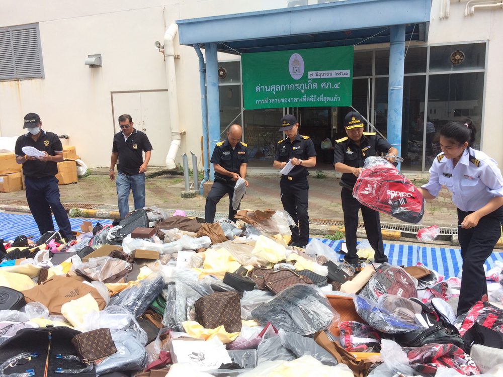 วันนี้ ( 7 มิ.ย.61 ) ที่ด้านหน้าอาคารเตาเผาขยะแห่งใหม่ เทศบาลนครภูเก็ต ต.ตลาดใหญ่ อ.เมืองภูเก็ต นางกาญจนา สุวานิโช นายด่านศุลกากรภูเก็ต พร้อมเจ้าหน้าที่ศุลกากรภูเก็ตและสื่อมวลชนภูเก็ต ร่วมเป็นสักขีพยานในการทุบทำลายสินค้าลักลอบหนีศุลกากรประเภทสินค้าละเมิดลิขสิทธิ์ และเครื่องหมายการค้าที่คดีได้ถึงที่สุดแล้ว รวมทั้งหมดกว่า 3,000 รายการ มูลค่าประมาณ 1,800,000 บาท ซึ่งสินค้าดังกล่าว ประกอบด้วย เสื้อผ้า หมวก กระเป๋า นาฬิกา เข็มขัด และรองเท้า ภายในแบรนด์ adidas, Supreme , Nike ,Nontblanc ,Puma , Louis vuiton ,Chanel, Rolex และสินค้าประเภทต้องห้าม อาทิเช่น อุปกรณ์บารากู บุหรี่ไฟฟ้า ทั้งนี้ นางกาญจนา พร้อมด้วยเจ้าหน้าที่ศุลกากรได้ร่วมใช้มีดทำการกรีดและทุบทำลายสินค้าให้เกิดความเสียหาย ก่อนที่จะให้รถแบ็คโฮเข้าเหยียบ บดทำลาย และทำการตักขึ้นรถบรรทุกลำเลียงเข้าสู่เตาเผาขยะเพื่อเผาทำลายตามขั้นตอนต่อไป