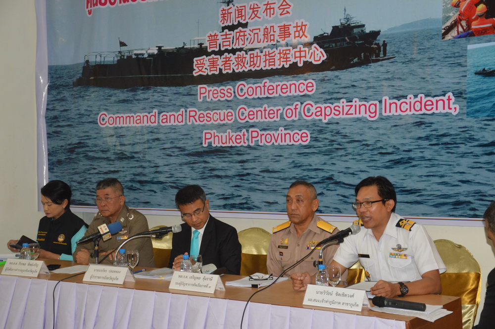 นายนรภัทร ปลอดทอง ผู้ว่าราชการจังหวัดภูเก็ต พร้อมด้วย พลเรือตรีเจริญพล คุ้มราษี รองผู้บัญชาการทัพเรือภาคที่ 3 พลตำรวจตรีธีระพล ทิพย์เจริญ ผู้บังคับการตำรวจภูธรจังหวัดภูเก็ต นางศิรวี วาเล๊าะ ท่องเที่ยวและกีฬาจังหวัดภูเก็ต และ นายวิวัธน์ ชิดเชิดวงศ์ ผู้อำนวยการสำนักงานเจ้าท่าภูมิภาคสาขาภูเก็ต ร่วมแถลงข่าวต่อสื่อมวลชน เกี่ยวกับความคืบหน้ากรณีเรือล่มในจังหวัดภูเก็ต โดยมีหัวหน้าส่วนราชการและสื่อมวลชนกว่า 50 คนเข้าร่วม
