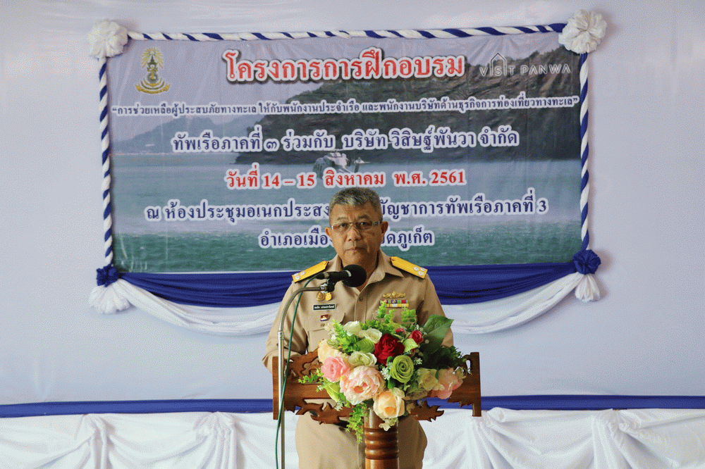 วันนี้ (14 ส.ค. 61) ที่ทัพเรือภาคที่ 3 พล.ร.ท.สมนึก เปรมปราโมทย์ ผู้บัญชาการทัพเรือภาคที่ 3 เป็นประธานในการฝึกอบรมการช่วยเหลือผู้ประสบภัยทางทะเลให้กับพนักงานประจำเรือและพนักงานบริษัทด้านการท่องเที่ยว โดยมีพนักงานประจำเรือและพนักงานบริษัทด้านธุรกิจการท่องเที่ยวทางทะเล และผู้เกี่ยวข้องเข้าร่วม พล.ร.ท. สมนึก เปรมปราโมทย์ ผู้บัญชาการทัพเรือภาคที่ 3 กล่าวว่า ปัจจุบันการท่องเที่ยวทางทะเลในพื้นที่จังหวัดภูเก็ตนับว่ามีความสำคัญสามารถสร้างรายได้ให้กับประเทศปีละหลายหมื่นบาท ดังนั้นการสร้างความเชื่อมั่นด้านความปลอดภัยทางทะเลจึงนับว่ามีความสำคัญเป็นอย่างยิ่ง