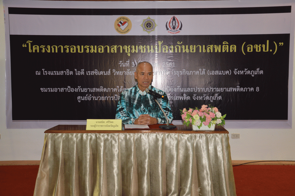 วันนี้ (31 ส.ค. 61) ที่โรงแรมไอดีเรสซิเดนซ์ อ. เมือง จ. ภูเก็ต นายสนิท ศรีวิหค รองผู้ว่าราชการจังหวัดภูเก็ต เป็นประธานเปิดการอบรมอาสาชุมชนป้องกันยาเสพติด (อชป.) โดยมีนายนุกูลกิจ ทองจันทร์ กรรมการชมรมอาสาป้องกันยาเสพติดภาคใต้ตอนบน แกนนำหมู่บ้าน/ ชุมชน อาสาสมัครชุมชนต่าง ๆ กว่า 100 คน เข้าร่วม นายนุกูลกิจ กล่าวว่า สถานการณ์การแพร่ระบาดของยาเสพติดยังเป็นปัญหาที่สร้างความเดือดร้นและส่งผลกระทบต่อสถาบันครอบรัว โรงเรียน ชุมชนและสังคมอย่างมาก ศูนย์อำนวยการป้องกันและปราบปรามยาเสพติดแห่งชาติ จึงได้มีคำสั่งเรื่องแผนป้องกันและแก้ไขปัญหายาเสพติดต่อย่างเร่งด่วน ปี 2561 ขึ้นเพื่อเร่งรัดการป้องกันและแก้ไขปัญหายาเสพติดตามนโยบายรัฐบาล โครงการไทยนิยมยั่งยืนในกรอบที่ 9 ร่วมแก้ไขปัญหายาเสพติดและเสริมการปฏิบัติของแผนประชารัฐร่วมใจปลอดภัยยาเสพติดปี 2561 ให้บรรลุผลสำเร็จภายใต้แผนป้องกันและแก้ไขปัญหายาเสพติดในหมู่บ้าน/ ชุมชน กำหนดให้ลดปัญหาการแพร่ระบาดของยาเสพติดและสร้างระบบป้องกันภัยยาเสพติดในหมู่บ้าน/ชุมชน โดยเร่งสร้าง/ ขยายการมีส่วนร่วมของชุมชนด้วยการจัดตั้งกลุ่มอาสา/ เครือข่ายอาสาภาคประชาชนทุกรูปแบบ เพื่อช่วยเป็นหูเป็นตาสอดส่อง เฝ้าระวังพื้นที่เสี่ยงต่าง ๆ เพื่อดำเนินการป้องกันก่อนเกิดปัญหา