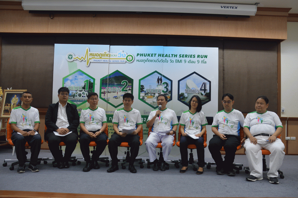 วันนี้ (17 ต.ค. 61) ที่ห้องประชุมชั้น 5 สำนักงานสาธารณสุขจังหวัดภูเก็ต นายแพทย์ธนิศ เสริมแก้ว นายแพทย์สาธารณสุขจังหวัดภูเก็ตเป็นประธานในการแถลงข่าวการจัดโครงการหมอภูเก็ตชวนวิ่ง Phuket health series Run วิ่งวัดใจ BMI 9 เดือน 9 กิโล โดยมีผู้อำนวยการโรงพยาบาลต่าง ๆ ในจังหวัดภูเก็ตและภาคีเครือข่ายเข้าร่วม