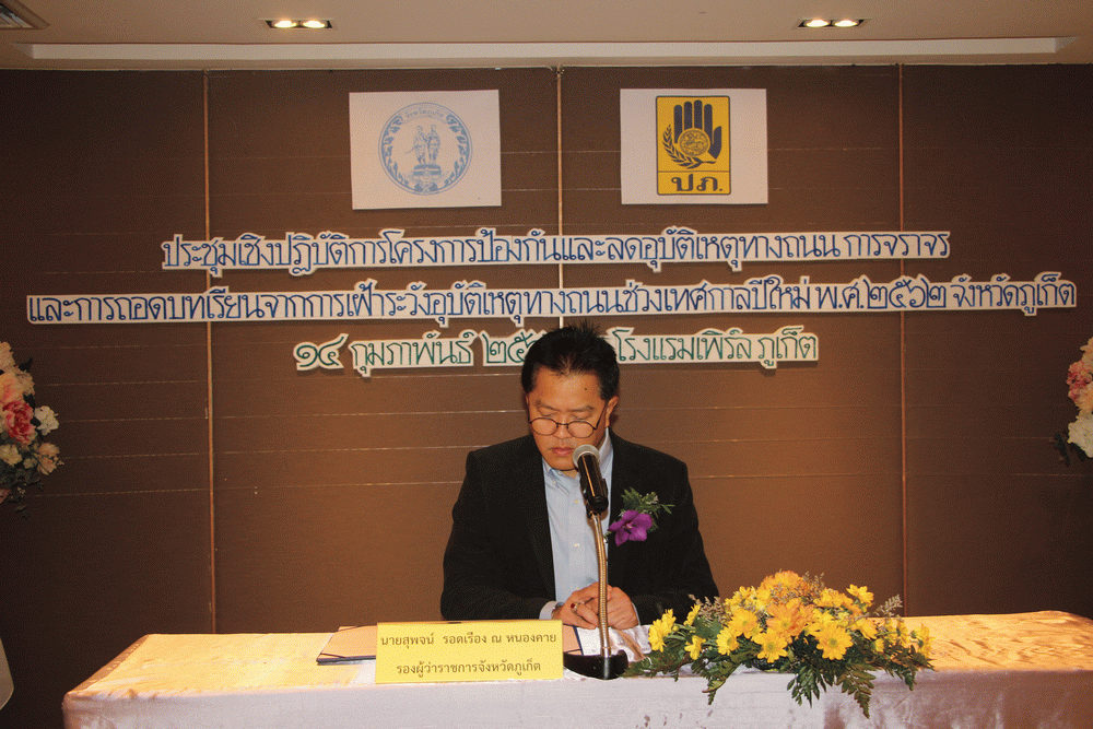 วันนี้ (14 กุมภาพันธ์ 2562) ที่ห้องประชุมเซ้าท์ซีเพิร์ล 1 โรงแรมเพิร์ลภูเก็ต อำเภอเมืองภูเก็ต จังหวัดภูเก็ต นายสุพจน์ รอดเรือง ณ หนองคาย รองผู้ว่าราชการจังหวัดภูเก็ต เป็นประธานเปิดการประชุมเชิงปฏิบัติการโครงการป้องกันและลดอุบัติเหตุทางถนนและถอดบทเรียน จากการเฝ้าระวังอุบัติเหตุทางถนนช่วงเทศกาลปีใหม่พ.ศ 2562โดยมีนายอนุพงษ์ วาวงศ์มูล ปลัดจังหวัดภูเก็ต นายมงคล เต็มรัตน์ หัวหน้าฝ่ายป้องกันและปฏิบัติการสำนักงานบรรเทาธารณภัยจังหวัดภูเก็ตและภาคีเครือข่ายเข้าร่วม นายมงคล กล่าวว่า จากการรณรงค์ป้องกันและลดอุบัติเหตุทางถนนช่วงเทศกาลปีใหม่ 2562 ระหว่างวันที่ 27 ธันวาคม 2561 ถึงวันที่ 2 มกราคม 2562 รวม 7 วันที่ผ่านมาจังหวัดภูเก็ต มีสถิตอุบัติเหตุจำนวน 55 ครั้งเปรียบเทียบกับปีที่แล้วจำนวน 64 ครั้งเพิ่มขึ้น 9 ครั้งจำนวนผู้บาดเจ็บ จำนวน 46 คนเปรียบเทียบกับปีที่แล้วจำนวน 53 คนเพิ่มขึ้น 7 คนและมีผู้เสียชีวิต 6 รายเปรียบเทียบกับปีที่แล้ว จำนวน 2 รายเพิ่มขึ้นจำนวน 4 ราย ซึ่งจะเห็นว่ายังไม่บรรลุตามเป้าหมายและวัตถุประสงค์แต่อย่างใด ดังนั้นสำนักงานป้องกันและบรรเทาสาธารณภัยจังหวัดภูเก็ตร่วมกับหน่วยงานภาคีเครือข่ายทุกภาคส่วนและกำหนดให้มีการประชุมเชิงปฏิบัติการโครงการป้องกันและลดอุบัติเหตุทางถนนและถอดบทเรียน จากการเฝ้าระวังอุบัติเหตุทางถนนช่วงเทศกาลปีใหม่ 2562 จังหวัดภูเก็ตทั้งในระดับจังหวัดระดับอำเภอและองค์กรปกครองส่วนท้องถิ่นโดยเชิญผู้แทนหน่วยงานภาคีเครือข่ายทุกภาคส่วนทั้งรัฐเอกชนองค์การปกครองส่วนท้องถิ่นองค์การสาธารณะ กุศล เข้าร่วมจำนวน 100 คน การจัดประชุมดังงกล่าวมีวัตถุประสงค์ เพื่อรณรงค์ให้เกิดความรู้ความตระหนักความเข้าใจเกี่ยวกับกฎหมายจราจรมารยาทในการขับขี่และรู้จักป้องกันตัวเองขณะขับขี่ยานพาหนะตลอดจนวิธีการแก้ไขปัญหาในขณะเกิดเหตุและหลัง เกิด เหตุ เพื่อเสริมสร้างจิตสำนึกในเรื่องความปลอดภัยในการใช้รถใช้ถนนโดยให้ประชาชนมีส่วนร่วมในการป้องกันและลดอุบัติเหตุทางถนน