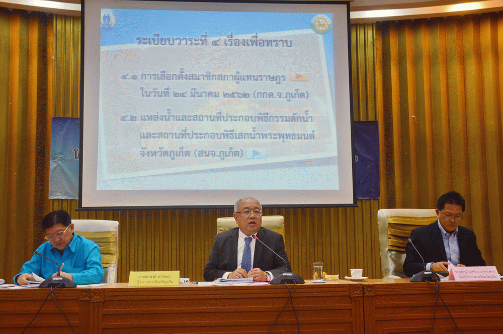 วันนี้ (22 ก.พ. 62) ที่ห้องประชุมศาลากลางจังหวัดภูเก็ตชั้น 2 อาคารคอซิมบี้ นายภัคพงศ์ทวิพัฒน์ ผู้ว่าราชการจังหวัดเป็นประธาน จัดการประชุมผู้บริหารองค์กรปกครองส่วนท้องถิ่น โดยมีนายประกอบ วงศ์มณีรุ่ง รองผู้ว่าราชการจังหวัดภูเก็ต นายวิญญ์ สิทธิเชนทร์ ท้องถิ่นจังหวัดหวัดภูเก็ต ผู้นำองค์กรปกครองส่วนท้องถิ่นและส่วนราชการที่เกี่ยวข้องเข้าร่วม นายภัคพงศ์กล่าวว่า การประชุมในวันนี้เพื่อเป็นการติดตามการทำงานขององค์กรปกครองส่วนท้องถิ่นต่างๆทั้งในเรื่องการเร่งรัดการ เบิกจ่ายงบประมาณเพื่อให้การเบิกจ่ายเป็นไป ตามแผนที่กำหนดไว้ และเป็นการรับทราบปัญหาและอุปสรรคของโครงการต่างๆที่มีการเบิกจ่ายงบประมาณไม่เป็น ตาม แผนที่วางไว้ เพื่อให้ท้องถิ่น แต่ละแห่งได้มีการเบิกจ่ายได้อย่างรวดเร็วยิ่งขึ้น