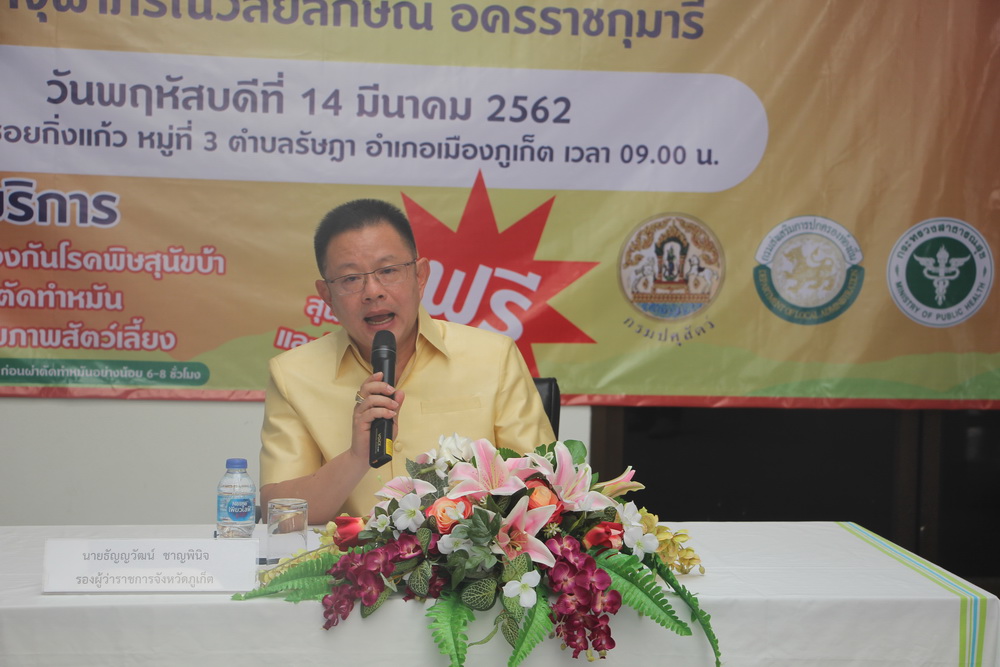 วันนี้ (14 มีนาคม 2562) ที่ชุมชนซอยกิ่งแก้ว หมู่ที่ 3 ตำบลรัษฎา อำเภอเมืองภูเก็ต นายธัญญวัฒน์ ชาญพินิจ รองผู้ว่าราชการจังหวัดภูเก็ต เป็นประธานเปิดโครงการความร่วมมือการรณรงค์ป้องกันโรคพิษสุนัขบ้า ปีงบประมาณพ. ศ. 2562 ภายใต้โครงการสัตว์ปลอด โรคคนปลอดภัย จากโรคพิษสุนัขบ้า ตามพระปณิธานศาสตราจารย์ ดร. สมเด็จพระเจ้าลูกเธอเจ้าฟ้าจุฬาภรณวลัยลักษณ์ อัครราชกุมารี โดยมีนายมนัส เทพรักษ์ ปศุสัตว์จังหวัดภูเก็ต นายภูดิท รักษาราษฎร์ นายกเทศมนตรีตำบลรัษฎา นางบุษยา ใจเปี่ยม ประชาสัมพันธ์จังหวัดภูเก็ต ส่วนราชการและประชาชนเข้าร่วม นายภูดิท กล่าวว่า ด้วยกรมส่งเสริมการปกครองท้องถิ่น กระทรวงมหาดไทย กรมปศุสัตว์ กระทรวงเกษตรและสหกรณ์ กรมควบคุมโรค กระทรวงสาธารณสุข ร่วมกันจัดทำโครงการความร่วมมือรณรงค์ป้องกันโรคพิษสุนัขบ้า ปีงบประมาณ พ.ศ. 2562 ภายใต้โครงการสัตว์ปลอดโรค คนปลอดภัย จากโรคพิษสุนัขบ้า ตามพระปณิธานศาสตราจารย์ ดร. สมเด็จพระเจ้าลูกเธอเจ้าฟ้าจุฬาภรณวลัยลักษณ์อัครราชกุมารี ระหว่างวันที่ 1 มีนาคม - 30 มิถุนายน 2562 โดยมีวัตถุประสงค์เพื่อให้สุนัขและแมวได้รับการฉีดวัคซีนป้องกันโรคพิษสุนัขบ้าครอบคลุมทุกพื้นที่ และดำเนินการต่อเนื่องเป็นประจำทุกปี ซึ่งกิจกรรมการดำเนินงานประกอบด้วย การฉีดวัคซีนป้องกันโรคพิษสุนัขบ้า การสำรวจและขึ้นทะเบียนสุนัขและแมว การผ่าตัดทำหมัน การประชาสัมพันธ์ให้ความรู้เรื่องโรคพิษสุนัขบ้าและการส่งเสริมให้ประชาชนเลี้ยงสุนัขและแมวอย่างถูกวิธีและมีความรับผิดชอบ ผลที่คาดว่าจะได้รับสุนัขและแมวได้รับวัคซีนป้องกันโรคพิษสุนัขบ้าครอบคลุมทุกพื้นที่ประชาชนเลี้ยงสุนัขและแมวอย่างถูกวิธีและมีความรับผิดชอบ ไม่ปล่อยสัตว์เลี้ยงให้เป็นสัตว์จรจัดลดปัญหาการเพิ่มจำนวนของสุนัขแมวจรจัด ตามพื้นที่สาธารณะซึ่งหน่วยงานที่เกี่ยวข้องสามารถร่วมกันสร้างพื้นที่ปลอดโรคพิษสุนัขบ้า และป้องกันไม่ให้คนเสียชีวิตด้วยโรคพิษสุนัขบ้า