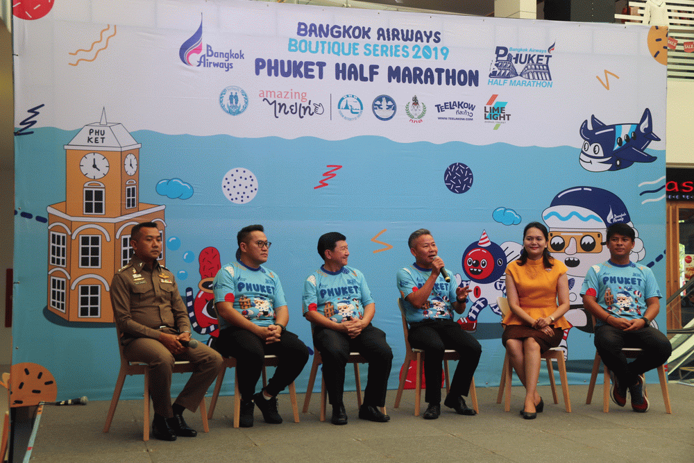 วันนี้ (19 มิถุนายน 2561) ที่ศูนย์การค้าไลม์ไลท์อเวนิว จ. ภูเก็ต นายประกอบ วงศ์มณีรุ่ง รองผู้ว่าราชการจังหวัดภูเก็ต นายกฤตธกร สิรภาพจน์ ผู้อำนวยการอาวุโส ส่วนสื่อสารการตลาด บริษัท การบินกรุงเทพ จำกัด (มหาชน) หรือสายการบินบางกอกแอร์เวย์ส นางกนกกิตติกา กฤตย์วุฒิกร ผู้อำนวยการการท่องเที่ยวแห่งประเทศไทย สำนักงานภูเก็ต นายกวี ตันสุคตานนท์ รองนายกเทศมนตรีนครภูเก็ต พ.ต.ท.ปองภพ ประสบพิชัย รองผู้กำกับการจราจร สถานีตำรวจภูธรเมืองภูเก็ต และบริษัท ทีละก้าว จำกัด โดยนายพีรดนย์ สุขสวัสดิ์ ผู้อำนวยการการแข่งขัน ร่วมกันแถลงข่าวรายการวิ่ง "บางกอกแอร์เวย์สภูเก็ตฮาล์ฟมาราธอน (Bangkok Airways Phuket Half-Marathon)" รายการวิ่งที่ 4 ของ "บางกอกแอร์เวย์ส บูทีค ซีรี่ย์ 2019" (Bangkok Airways Boutique Series 2019) นายกฤตธกร สิรภาพจน์ ผู้อำนวยการอาวุโส ส่วนสื่อสารการตลาด กล่าวว่า "บางกอกแอร์เวย์สภูเก็ตฮาล์ฟมาราธอน (Bangkok Airways Phuket Half Marathon) เป็นการแข่งขันวิ่งรายการที่ 4 จากทั้งหมด 6 รายการ ของบางกอกแอร์เวย์ส บูทีค ซีรี่ย์ 2019 (Bangkok Airways Boutique Series 2019) ซึ่งจะจัดขึ้นในวันอาทิตย์ที่ 4 สิงหาคม 2562 ณ สวนสาธารณะสะพานหิน เพื่อส่งเสริมการท่องเที่ยวเชิงกีฬาของจังหวัดภูเก็ต โดยการจัดแข่งขันในครั้งนี้ได้รับการสนับสนุนจากจังหวัดภูเก็ต รวมไปถึงการประสานงานกับภาคส่วนที่เกี่ยวข้องในพื้นที่ร่วมบูรณาการการจัดกิจกรรม โดยมีบริษัท ทีละก้าว จำกัด ซึ่งเป็นมืออาชีพด้านการจัดการแข่งขันวิ่งของประเทศ มาช่วยออกแบบเส้นทางวิ่งให้มีความโดดเด่นและมีกลิ่นอายความเป็นบูทีคในแบบฉบับของบางกอกแอร์เวย์ส และหนึ่งในไฮไลท์ของปีนี้คือเสื้อที่ใช้ในการแข่งขันได้รับการออกแบบโดยสตูปิดนูปแม๊ก (Stupidnoobmacc) ศิลปิน อิลาสเตเตอร์ชื่อดังชาวไทยเจ้าของผลงาน "เบบี้บอย (BabyBoy) มาร่วมออกแบบคอลเลคชั่นพิเศษสำหรับรายการวิ่ง บางกอกแอร์เวย์ส บูทีค ซีรี่ย์ 2019 โดยเฉพาะ โดยนำจุดเด่นของแต่ละจังหวัดมาเป็นแนวคิดในการออกแบบคาแรคเตอร์ให้กับเบบี้บอยให้มีเอกลักษณ์ไม่ซ้ำกัน เพื่อใช้ในการจัดทำเสื้อวิ่ง เหรียญรางวัล และถ้วยรางวัล ให้เหล่านักวิ่งได้เก็บสะสมเป็นที่ระลึกจากทั้ง 6 รายการวิ่งตลอดปี 2562 อย่างเช่นที่จังหวัดภูเก็ตก็ได้นำสัญลักษณ์ของไข่มุกแห่งอันดามันมาออกแบบให้กับเบบี้บอย เพื่อแสดงถึงเอกลักษณ์ของจังหวัดภูเก็ต นายกฤตธกร กล่าวเสริม