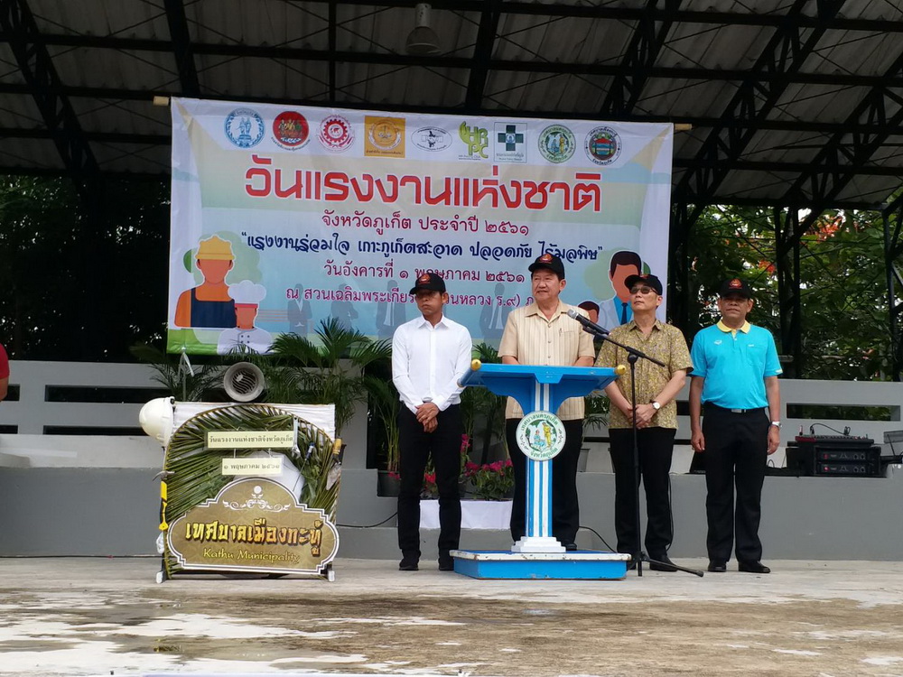 วันนี้ (1 พฤษภาคม 2561) ที่สวนเฉลิมพระเกียรติ (สวนหลวง ร.9) ภูเก็ต นายประกอบ วงศ์มณีรุ่ง รองผู้ว่าราชการจังหวัดภูเก็ต เป็นประธานเปิดการจัดงานวันแรงงานแห่งชาติจังหวัดภูเก็ต ประจำปี 2561 ซึ่งจัดขึ้นภายใต้คำขวัญ แรงงานร่วมใจ เกาะภูเก็ตสะอาด ปลอดภัย ไร้มลพิษ โดยมี นายชนินทร์ อุดมทรัพย์ รองเลขาธิการสมาพันธ์แรงงานรัฐวิสาหกิจสัมพันธ์ สาขาภูเก็ต ในนามประธานคณะกรรมการจัดงานวันแรงงานแห่งชาติจังหวัดภูเก็ต ประจำปี 2561, หัวหน้าส่วนราชการในสังกัดกระทรวงแรงงาน, ผู้บริหารองค์กรปกครองส่วนท้องถิ่น เข้าร่วม ซึ่งการจัดงานในครั้งนี้เกิดจากความร่วมมือของทุกภาคส่วน ประกอบด้วย ลูกจ้างทั้งในภาคเอกชน รัฐวิสาหกิจ ผู้แทนองค์กรลูกจ้าง ตัวแทนองค์กรนายจ้าง ซึ่งประกอบด้วย สมาพันธ์แรงงานรัฐวิสาหกิจสัมพันธ์ สาขาภูเก็ต สมาพันธ์แรงงานธุรกิจโรงแรมและบริการภูเก็ต ชมรมบริหารงานบุคคลจังหวัดภูเก็ต ชมรมการจัดการทรัพยากรมนุษย์ ชมรมความปลอดภัยจังหวัดภูเก็ต เทศบาลนครภูเก็ต เทศบาลเมืองกะทู้ หน่วยงานรัฐวิสาหกิจในจังหวัดภูเก็ต และหน่วยงานในสังกัดกระทรวงแรงงาน ได้ร่วมกันจัดกิจกรรมในครั้งนี้ขึ้น