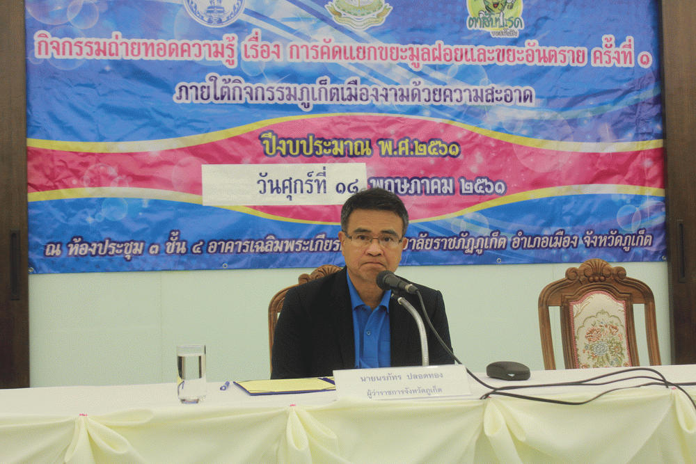 วันนี้ 18 พฤษภาคม 2561 นายนรภัทร ปลอดทอง ผู้ว่าราชการจังหวัดภูเก็ต เป็นประธานพร้อมบรรยายพิเศษให้ความรู้แก่ผู้เข้าร่วม กิจกรรมถ่ายทอดความรู้เรื่องการคัดแยกขยะมูลฝอยและขยะอันตรายครั้งที่ 1 ที่ห้องประชุม 3 อาคารเฉลิมพระเกียรติ มหาวิทยาลัยราชภัฏภูเก็ต โดยมีนายณฐวรรณ จำลองกาศ ผู้อำนวยการ สำนักงานทรัพยากรธรรมชาติและสิ่งแวดล้อมจังหวัดภูเก็ต พร้อมแจ้งหัวหน้าส่วนราชการสมาชิกเครือข่ายตาสับปะรดเฝ้าระวังขยะมูลฝอยและน้ำเสียจังหวัดภูเก็ตกว่า 400 คนเข้าร่วม นายนรภัทร ปลอดทอง ผู้ว่าราชการจังหวัดภูเก็ต กล่าวว่า จังหวัดภูเก็ตเป็นเมืองที่มีการขยายตัวเจริญเติบโตอย่างรวดเร็ว ทั้งการพัฒนาเมืองเพื่อรองรับการเติบโตในด้านสาธารณูปโภครวมถึงประชากรหลักและประชากรแฝงในรูปแบบของแรงงานหรือนักท่องเที่ยวที่เพิ่มมากขึ้นทุกปีซึ่งนอกจากจะเป็นการสร้างรายได้กระตุ้นเศรษฐกิจในพื้นที่แล้วแต่ปัญหาที่ตามมาและก่อให้เกิดวิกฤติส่งผลเสียต่อภาพลักษณ์ด้านการท่องเที่ยวของจังหวัดภูเก็ตคือปัญหาด้านสิ่งแวดล้อมโดยเฉพาะอย่างยิ่งปัญหาขยะมูลฝอยล้นเมือง และปัญหาเรื่องการลักลอบปล่อยน้ำเสียลงทะเลของสถานประกอบการต่างๆซึ่งจำเป็นต้องดำเนินการแก้ไขอย่างเร่งด่วนเนื่องจากส่งผลกระทบต่อภาพลักษณ์ของเมืองท่องเที่ยวได้ทำลายทัศนียภาพที่สวยงามของจังหวัดภูเก็ตรวมทั้งยังส่งผลให้นักท่องเที่ยวรวมถึงรายได้ของประชาชนในจังหวัดภูเก็ตลดลง เพื่อแก้ปัญหาดังกล่าว จังหวัดภูเก็ตมีนโยบายสร้างภูเก็ตให้สะอาดและสวยงามตามโครงการภูเก็ตสวยด้วยมือและใจเราโดยกำหนดจัดกิจกรรมประกวดความสะอาดในสถานที่ต่างๆประกอบด้วย สถานที่ราชการ,โรงเรียน,วัด,มัสยิด,ถนน,ห้องส้วมสาธารณะ ทั้งนี้อยากขอความร่วมมือพี่น้องประชาชนร่วมกันสร้างบ้านเมืองให้สะอาดโดยเริ่มจากการทำความสะอาดบ้านเรือนและบริเวณชุมชนของตนเองหรือแม้แต่การลดใช้ถุงพลาสติกโดยนำถุงผ้ามาใช้ใส่สิ่งของแทน เพื่อสร้างจังหวัดภูเก็ตให้มีความสะอาด สู่ภูเก็ตเมืองท่องเที่ยวนานาชาติบนพื้นฐานการพัฒนาที่ยั่งยืน